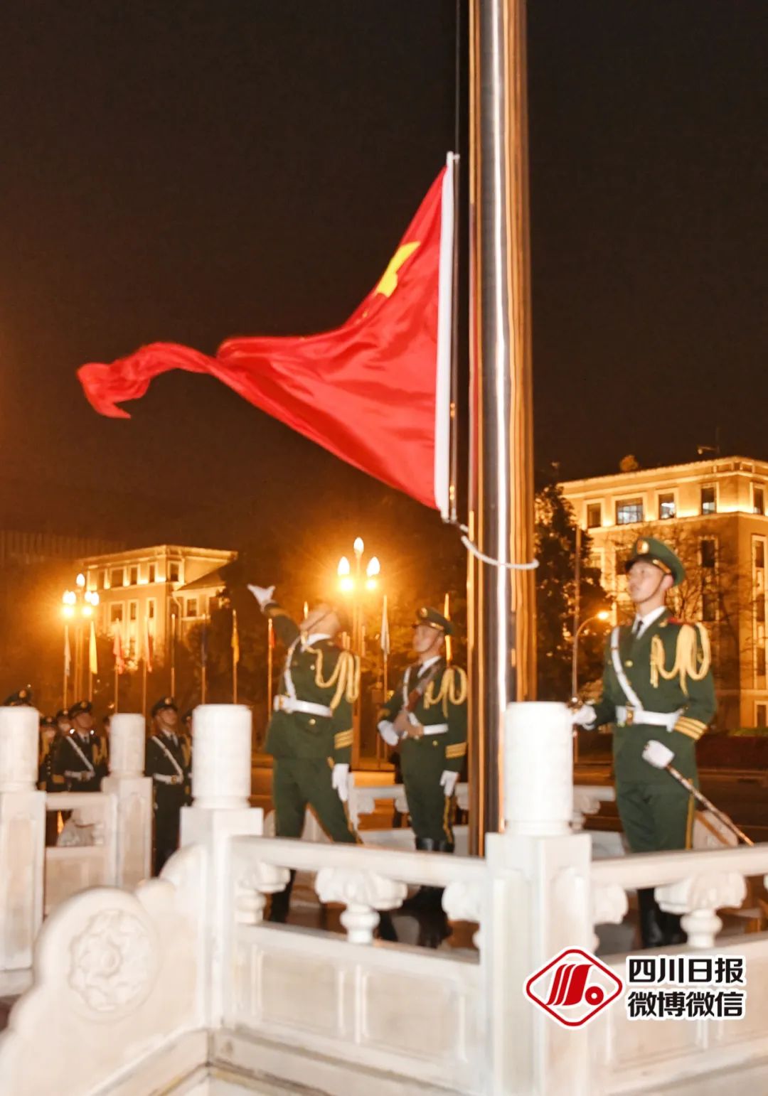 6时55分,“蓉城国旗护卫队”官兵们迈着铿锵有力的步伐来到升旗台。随后,擎旗手和升旗手齐步走上升旗台基座,护旗队员面向国旗分区站立。“向国旗——敬礼!”国旗护卫队领队发出响亮的口令,护旗队员行举枪礼,武警官兵行军礼,人们立正行注目礼,《义勇军进行曲》奏响。
