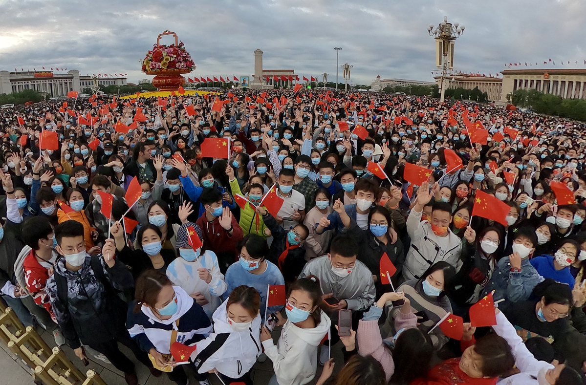 10月1日晨,游客挥舞国旗在北京天安门广场观看国庆升旗仪式。 中国日报记者 朱兴鑫 摄