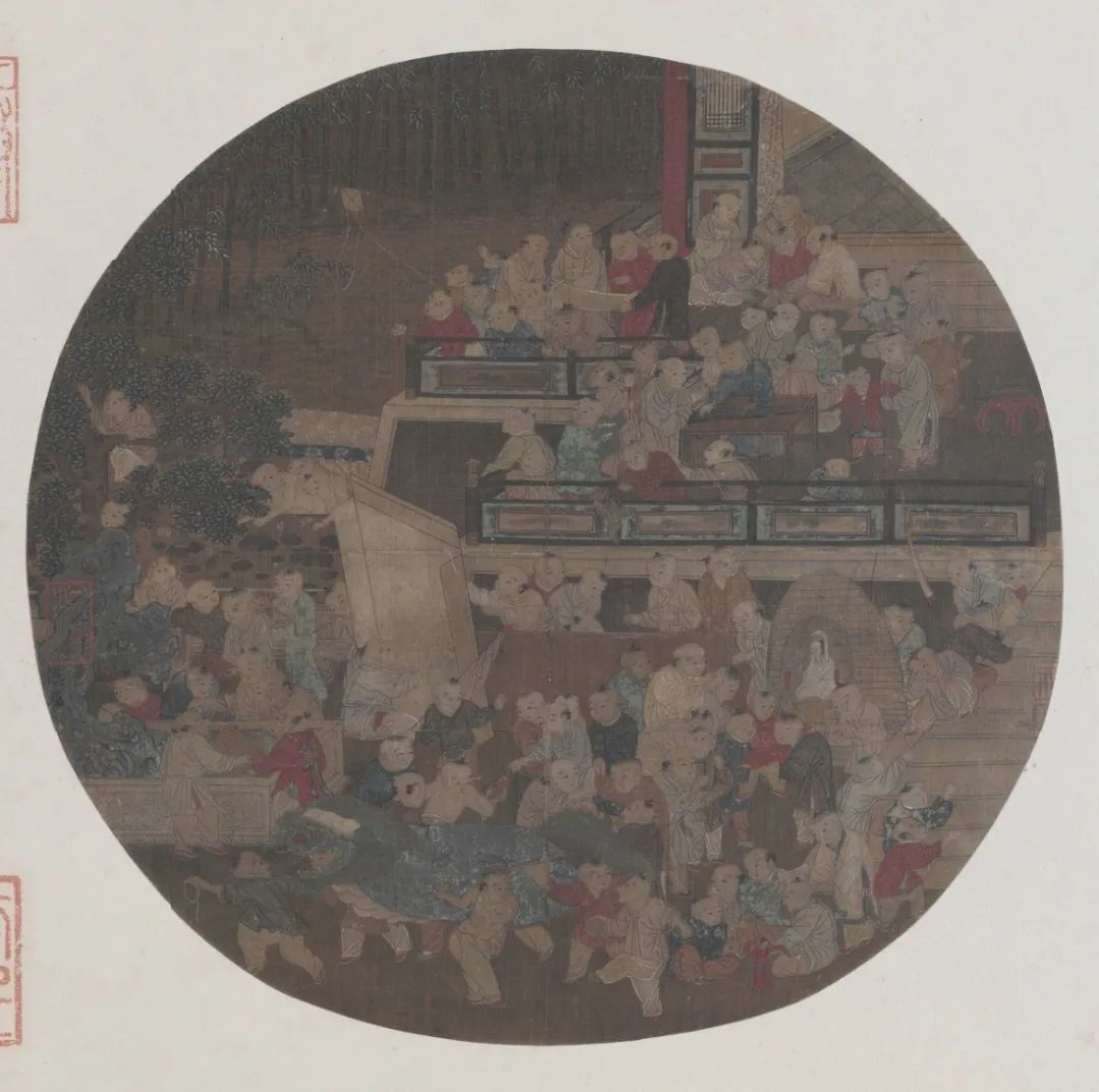 南宋画作《百子嬉春图》中,数十名孩童嬉戏其间,亭台之上琴棋书画,台下则有皮影、折桂等。来源/故宫博物院