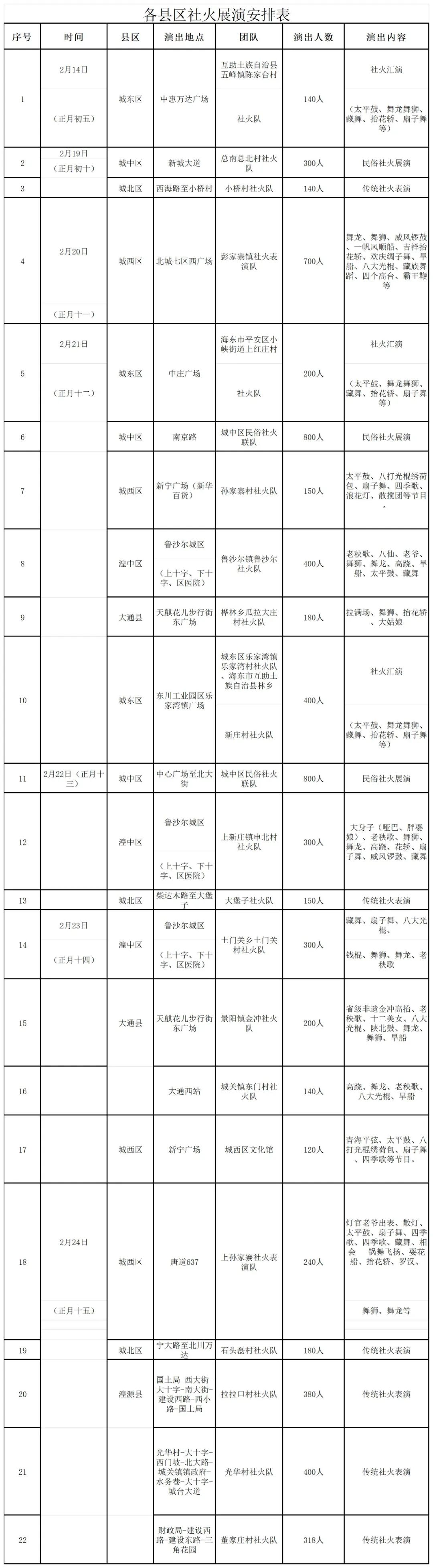 今天开始,各县区的社火队来西宁展演了,有互助五峰的社火,有平安小峡的社火,有大通景阳的社火,还有最近火爆出圈的湟中鲁沙尔的社火……哪天来,去哪看?安排表来了~