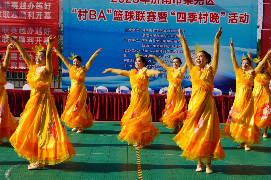 莱芜区文化和旅游局积极与区教体局、鹏泉街道对接,筹划举办2023济南市莱芜区“村BA”篮球联赛暨“四季村晚”活动。8月26日,在鹏泉街道陈梁坡村文体广场举办活动开幕式。开幕式当晚,广场上一边是对抗激烈的篮球赛,一边是载歌载舞的文艺演出,同时还有身着汉服的主播们在进行电商直播,形式多样的活动吸引了不同年龄段的观众。