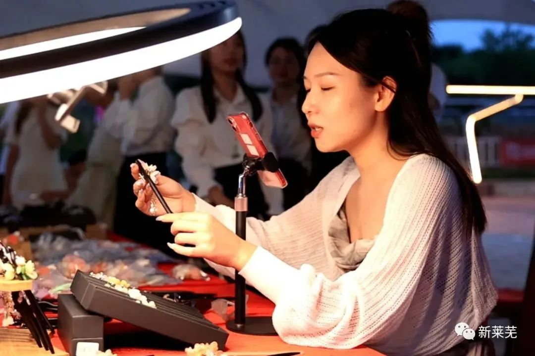看“村BA”“村晚”,购莱芜好货。广场中间巨大的天幕下,本地企业的主播们面向全球网友热情推介莱芜文创产品,直播间累计观看人数上万人,点赞数超过10万人次,线上订单持续火爆,观众现场购买争先恐后。