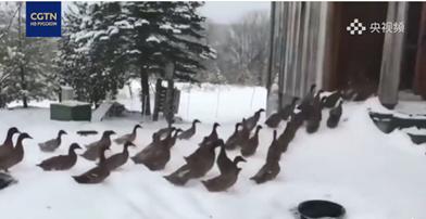 2、好冷鸭!鸭鸭出门遛弯被秒冻回屋 寒潮来势汹汹,温度不仅“冻哭”人,连毛绒绒的动物们都顶不住了!小鸭子们组团出门遛弯,不到一分钟就冻得仓皇而逃、飞着奔回屋,多一秒都不想再待!(@新华网)