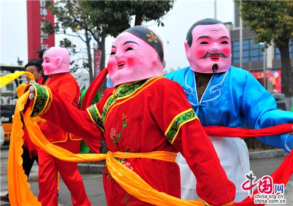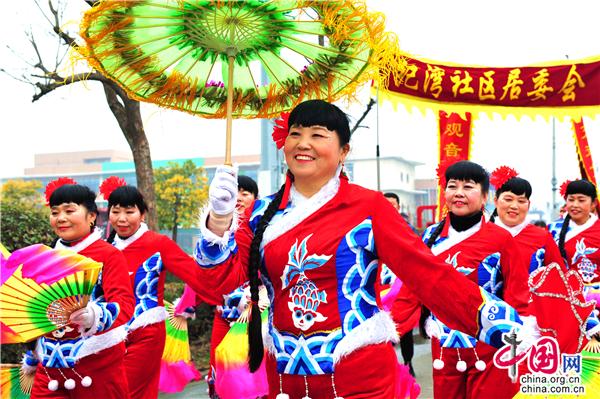 第三出场的是新源村的大头娃娃表演,大头娃娃们表演气氛真的很特别,那么多大头娃娃笑容满面、喜气洋洋、憨态可掬,现场广大群众更是个个脸上洋溢着藏不住的笑意,让新年的气氛又浓郁了十分;接着是观阁村代表队表演《大秧歌》,“秧歌”是我国人民喜闻乐见、具有代表性的一种民间舞蹈,秧歌队的表演,有四个特点:一是扭,二是走场,三是扮,四是唱。秧歌队的人数可多可少,少则几人,多则百人,既可以统一表演一个大型节目,也可以分别表演各自准备的小节目。秧歌队在锣鼓、唢呐的伴奏下,边扭边舞,走出各种队形,动作诙谐有趣、朴实可爱,具有广泛的娱乐性和群众性,很受广大群众的欢迎。