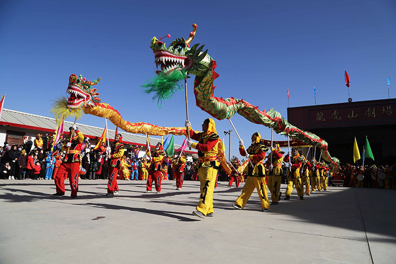 1月6日,甘肃省定西市安定区内官营镇万崖村社火队演练传统社火节目舞龙。