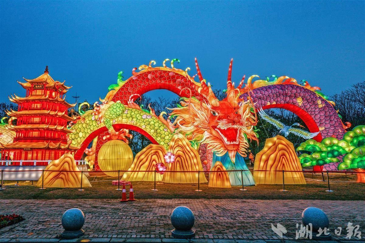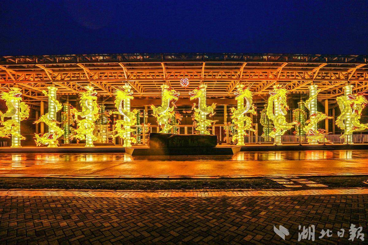 龙年要看“龙”灯。灯会东门主入口的“万象之门”灯组,高约17米,长45米,呈游龙戏珠状,气势恢宏,表达吉祥如意和飞黄腾达的美好愿望;东门草坪的“龙行雨施”灯组,隐喻长江巨龙,穿插布设长江流域黄鹤楼、苏式园林等文化元素造型花灯,助力武汉建设长江国家文化公园;“鲤鱼跳龙门”灯组活灵活现,游客穿行此门,寓意龙年行大运;布设在长江文明馆门前的龙灯组,十条盘龙抱柱而上,现场播放“遥远的东方有一条江,它的名字就叫长江,古老的东方有一条龙,它的名字就叫中国”,展示《龙的传人》自豪感。“除此之外,我们还布设了3组恐龙灯。”园方介绍,虽然恐龙不是龙,但由于“马门溪龙”是武汉自然博物馆镇馆之宝,所以灯会设计了“马门溪龙骨架、恐龙雪糕”等带“龙”字的灯组。