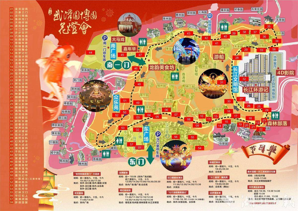 开篇“盛世龙年”版块彰显国泰民安,盛世龙年之景;“云海花境”版块主打十二花神迎春祝福新年;“江河文明”版块集合武汉自然博物馆文创、镇馆之宝和科普绘画精华;位于长江文明馆两侧草坪的“封神异兽”版块则以中国神话传说为元素,布设哪吒、白泽、姜子牙等神话人物和灵瑞,打造一场充满神仙瑞兽、奇花异草的东方美学奇幻境界;园区云梦湖上的“凤鸣楚歌”版块,借楚人崇凤之习俗,表达湖北中部腾飞之意;“时代苍穹”版块展现武汉现代城建发展;“上元市集”版块根据《东京梦华录》概念设计,复原唐宋烟火市井,融合沉浸演艺、百艺手作,突显穿越唐宋烟火概念;“汉口风华”版块重现灯影幢幢老街市的景象。此次灯会共有60余组花灯,观灯游线约为2800米。