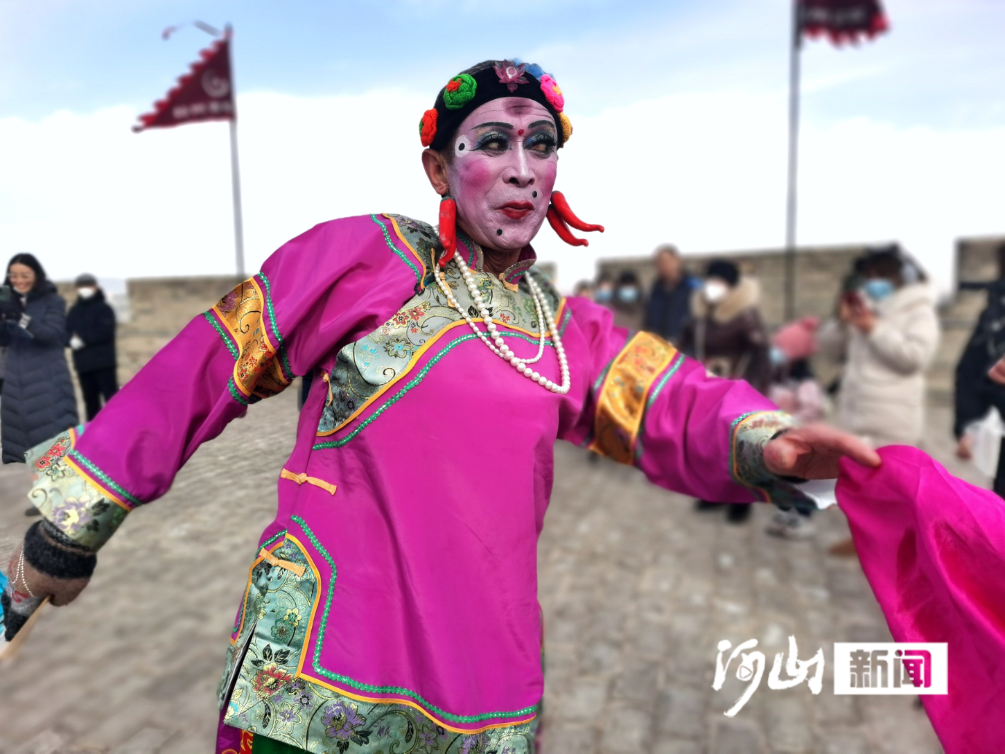 历史久远的蔚州古城墙之上,踩高跷、舞龙斗狮、划旱船、扭秧歌……蔚州镇几个村的社火队带来了形式多样的民俗表演,节目精彩纷呈,气氛欢快喜庆。居民游客欢聚古城,共同感受着传统的年味。