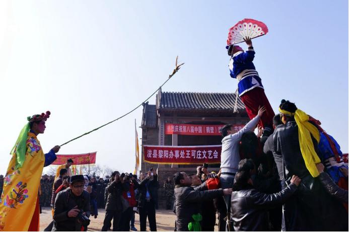 去浮邱山祭拜祖先只是浚县正月会的小序曲,到了正月初九那天,浚县庙会才会露出它真实的面貌。正月初九之后,浚县庙会就会迎来一股新的高潮。浚县庙会最有名的节庆活动就是社火,而社火技艺虽然在全国的很多农村都非常盛行,但是浚县社火却是最有名的。浚县社火最鼎盛的时期有接近150个社火班子,说是浚县村村有社火一点都不为过。为了这场表演,浚县的社火班子从腊八就开始训练,从白天到晚上,一直到正月初九。