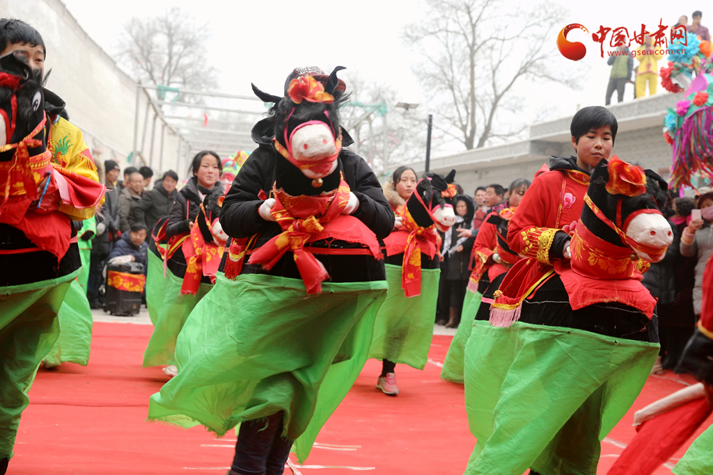 2月13日,张掖市新墩镇传统社火表演队的农民演员们正在表演骑马。当日,张掖市甘州区第六届传统社火展演在滨河新区举行,近万名市民和游客以欣赏传统社火的方式迎接即将到来的元宵节。