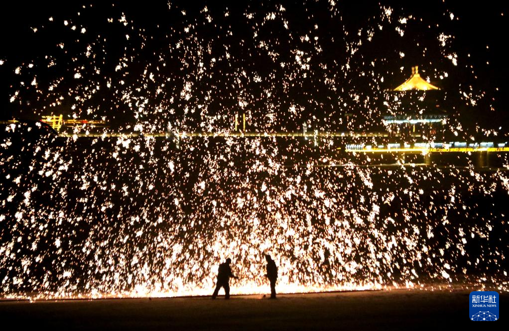 2月21日,在敦煌市党河风情线,民间艺人进行打铁花民俗表演。