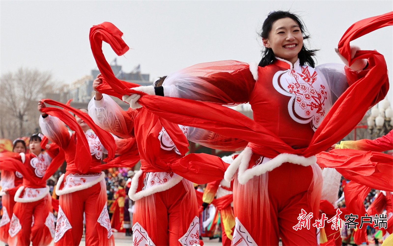 2月22日,秧歌队员在甘肃省和政县聚兴广场表演秧歌(无人机照片)。新华社发(史有东 摄)