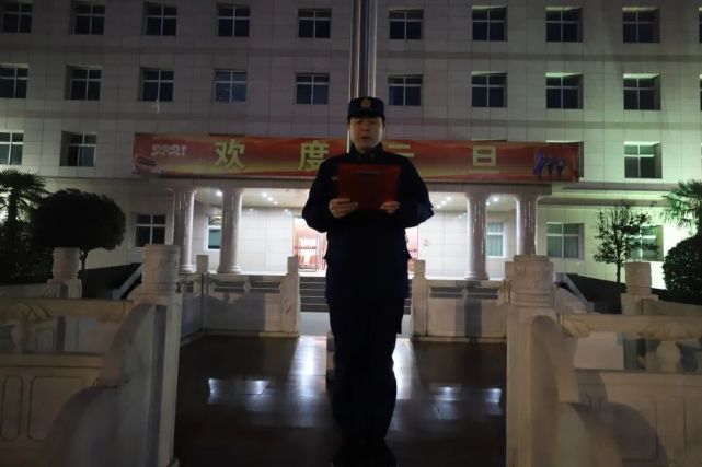 不忘初心,砥砺前行。1月1日上午7时30分,支队全体指战员整装列队,个个士气高昂、精神抖擞、昂首挺胸。“升旗仪式,现在开始!”随着指挥员一声令下,升旗手将手中的国旗奋力一扬,鲜艳的五星红旗伴随着雄壮的《义勇军进行曲》冉冉升起,在场的百余名指战员向国旗致以崇高的敬礼。