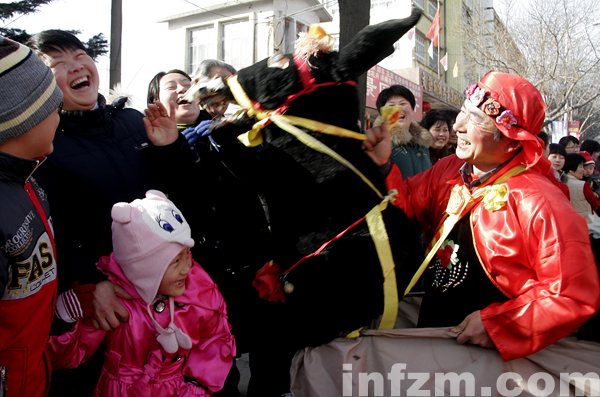 山东省文登市举办大型秧歌大赛,全市各乡镇16支代表队的近2000人参加,热闹的秧歌队伍长约5公里。这是一名演员和沿街观看秧歌大赛的群众互动。(新华社 于启波/图)