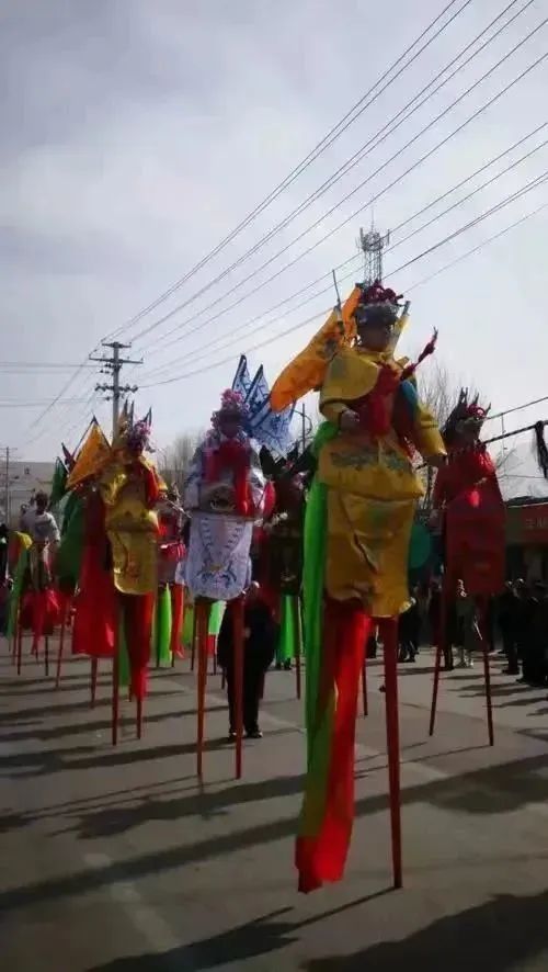 高跷民间称高拐子,踩高跷的人身着历史戏剧人物服装。一般扮演的有《断桥》《盗仙草》《挑黄袍》《唐僧取经》《八仙过海》《包公赔情》等戏剧中的人物。在强烈节奏的锣鼓音乐伴奏下,做行进队列或场地定点表演。如表演断桥,由许仙,青蛇、白蛇3人用秦腔调唱台词,加以简单的手势动作。