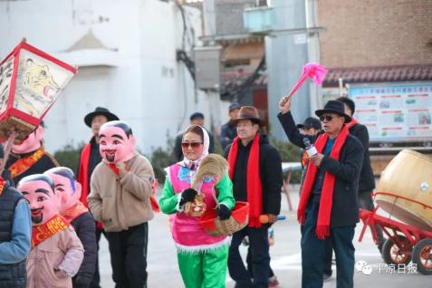 社火队中最具喜剧效果的“害婆娘”,由在村里开小商店的翟淑琳扮演。穿着红衣绿裤绣花鞋,脸敷“红二团”,腕提小竹笼,手拿笤帚的翟淑琳,浑身上下洋溢着喜气。一个能说会道会笑会调侃的“害婆娘”,会恰到好处地调动人们的情绪。排练现场,她带着一群由村里的小孩子装扮的“大头娃娃”,扭着小腰,一路为人们扫去“晦气”,俏皮、明快的动作传递着欢快纯朴的情感。“生活越来越好了,大家一起玩玩社火,闹闹新年,让人心里特别幸福和满足,今后的生活更有奔头!”翟淑琳开心地说。