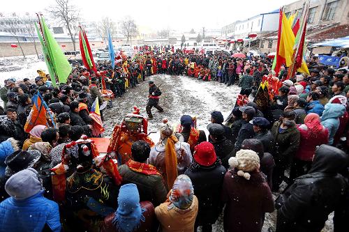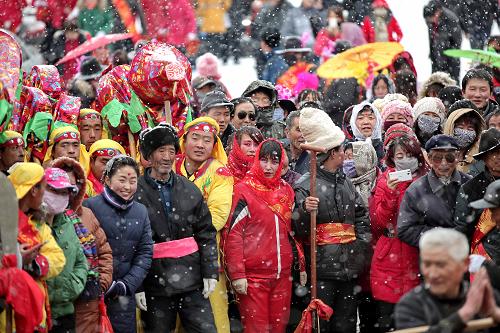 3月4日,社火队在雪中准备上场表演。新华社发(杨昕 摄)