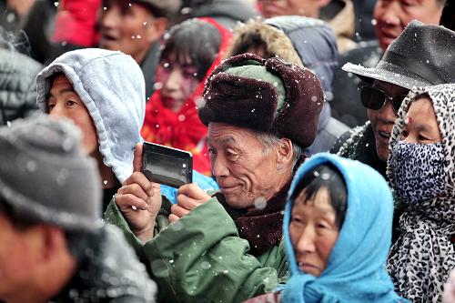 3月4日,一位老人在雪中用手机拍摄社火表演。新华社发(杨昕 摄)