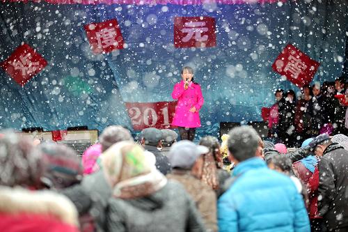 3月4日,社火队队员在雪中演唱秦腔。新华社发(杨昕 摄)