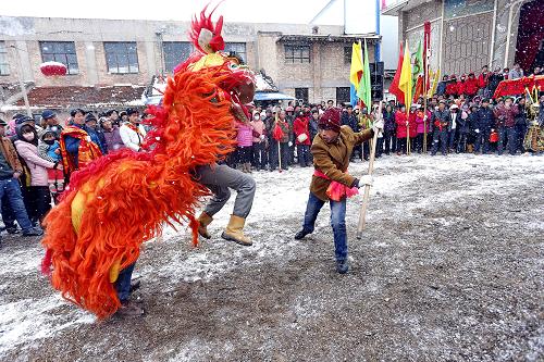 3月4日,社火队在雪中表演舞狮。新华社发(杨昕 摄)