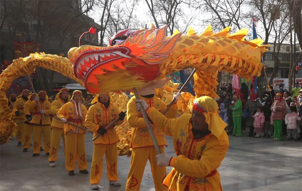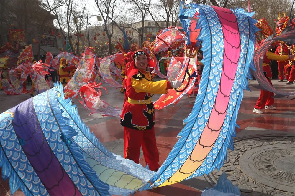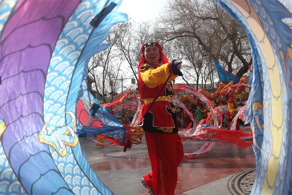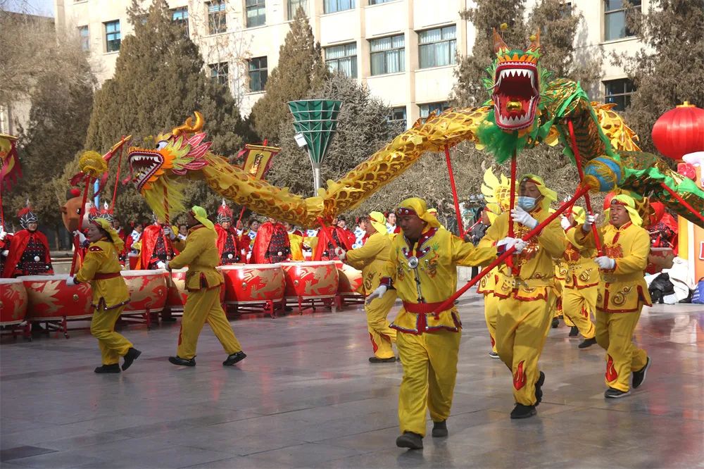 2024年2月6日,一支社火队在敦煌市政广场表演社火舞龙。
