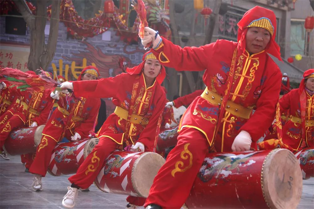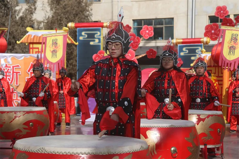 2024年2月6日,一支社火队在敦煌市政广场表演社火太平鼓。