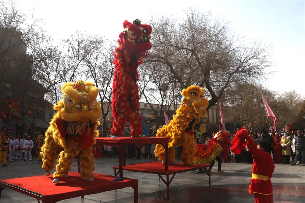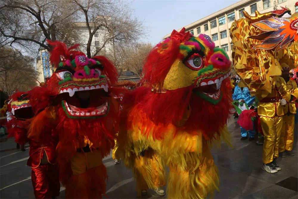 2024年2月6日,一支社火队在敦煌市政广场表演社火舞狮。