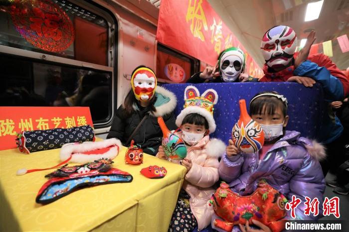 在列车文化活动的现场,还有精美绝伦的陇州布艺刺绣、木版年画、手绘脸谱等互动展示环节,但最吸引人的还是手工灯笼展,小兔子、小老虎、小老鼠……一个个挂在列车上的彩色灯笼随车摆动,好似在嬉戏打闹,无论大人孩子都爱不释手。