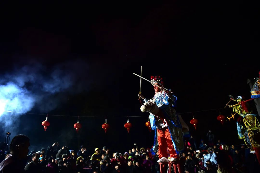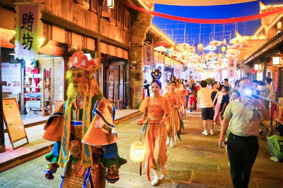 每晚7点,傩仙镇举行亮灯仪式,演员们身穿古装上演“快闪”活动