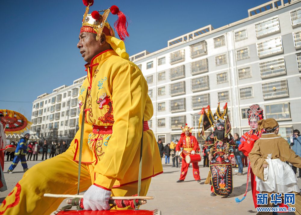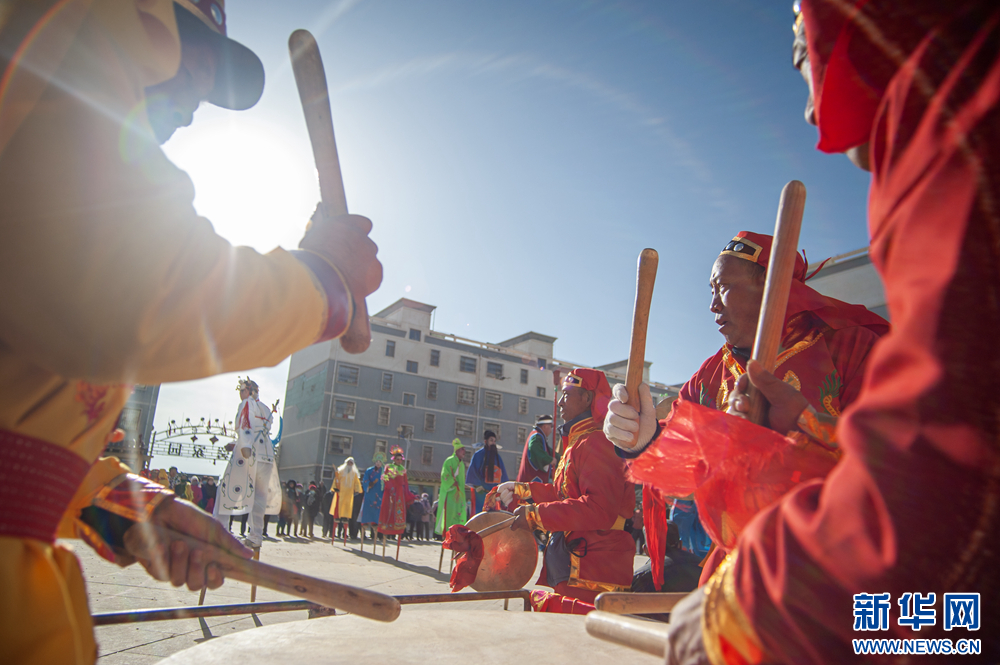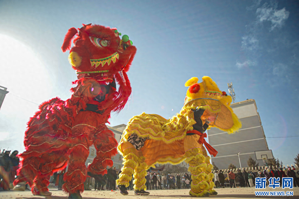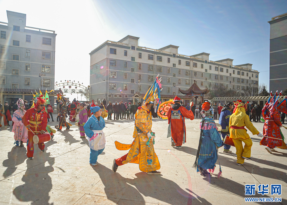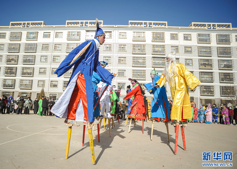 25日,在甘肃省张掖市甘州区碱滩镇刘庄村的文化广场上,村民自发组织的舞狮、秧歌、太平鼓、踩高跷等传统社火节目已开始排练,迎接新春佳节的到来。新华网发(刘旭明 摄)