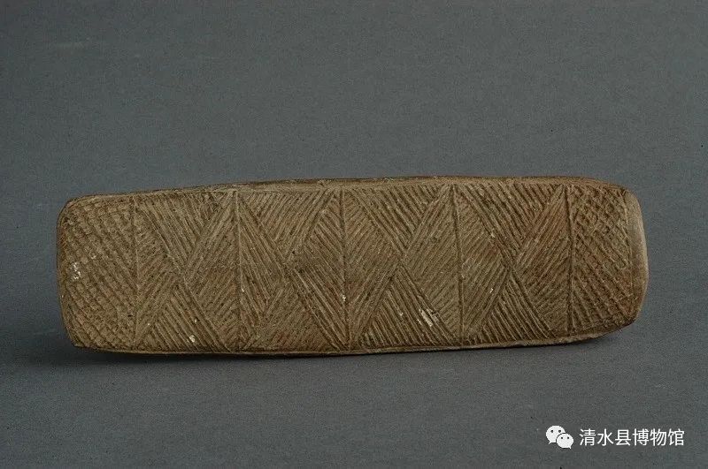齐家文化菱纹红陶条形拍,长19cm,宽6cm,厚1.5cm。陶拍泥质红陶,呈长条形,四角微圆,拍体凸鼓,整体表面饰凸线,呈菱形网格纹。