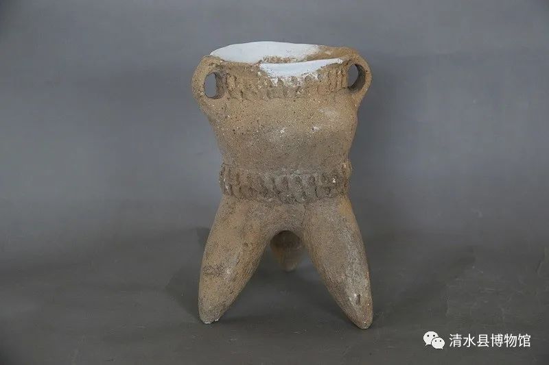 齐家文化绳纹灰陶鬲,高34cm,口径16.5cm。鬲呈夹砂红陶,侈口,束颈,深腹,高裆,袋足锥状,颈以下遍布粗绳纹。