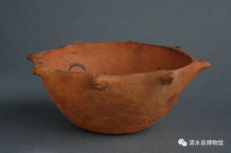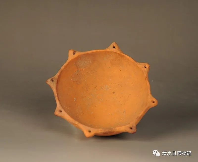 齐家文化八角红陶钵,高5cm,口径12cm。钵泥质红陶,侈口,斜壁,平底,口沿平,口沿部均匀置饰八角尖状饰,每尖角中有一穿孔,红陶细腻,制造精巧。