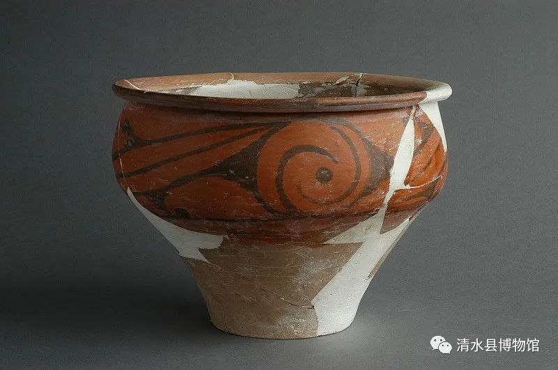 仰韶文化庙底沟类型涡纹彩陶盆,高28cm,口径26cm。陶盆泥质红陶,敛口,平唇微卷,上腹微鼓,收下腹,平底,口沿至鼓腹部绘以涡弦弧线纹连续始终。