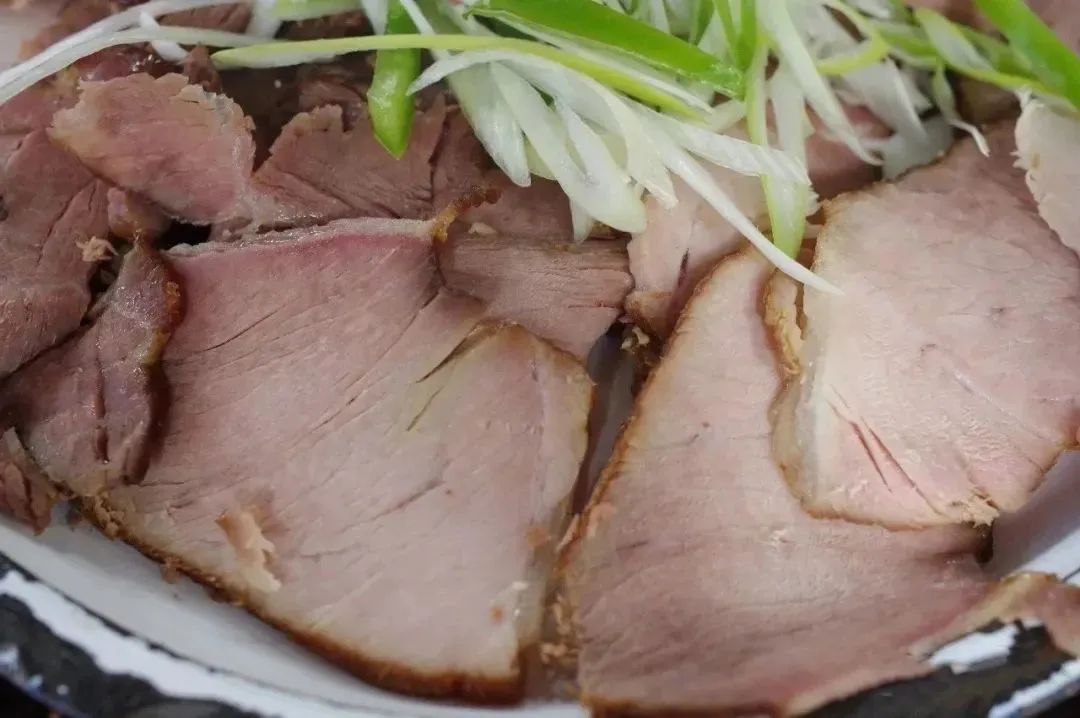 “第二套车”是卤肉。选用上好新鲜的猪肉,用老汤老卤文火长时间焖制而成,加若干调味料卤熟而成,卤肉色泽金黄,肥而不腻,香嫩可口,回味无穷。切片装盘,撒上一把青椒丝,既是点缀也是调味。浇上卤子的饧面,滑爽筋道,味道绝佳。