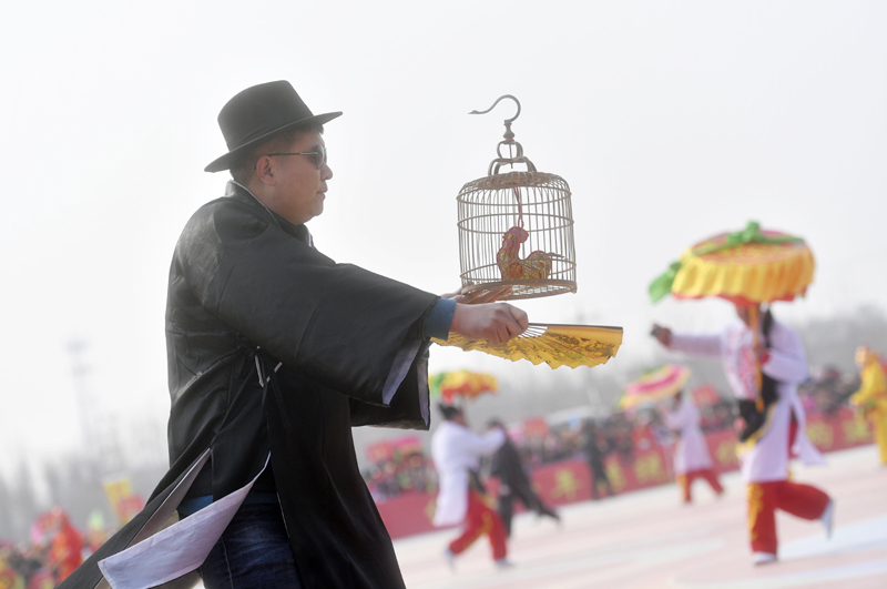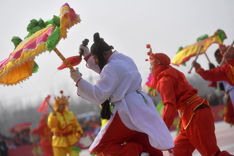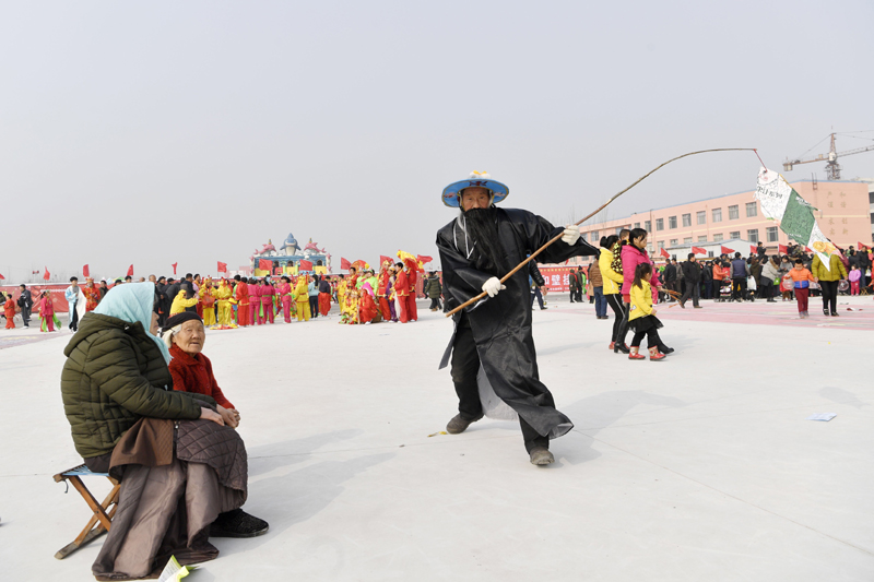 2月26日,阳信县洋湖乡后高村秧歌队队员(右一)表演姜太公钓鱼。