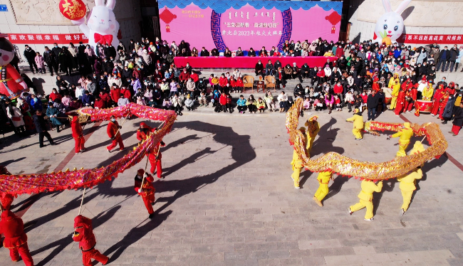 每日甘肃网讯(新甘肃·每日甘肃网见习记者 马腾飞)1月23日,酒泉市肃北县开展“玉兔迎新春·奋进新征程”社火大拜年活动。活动现场,敲锣打鼓、秧歌舞狮、社火展演,浓浓年味扑面而来。
