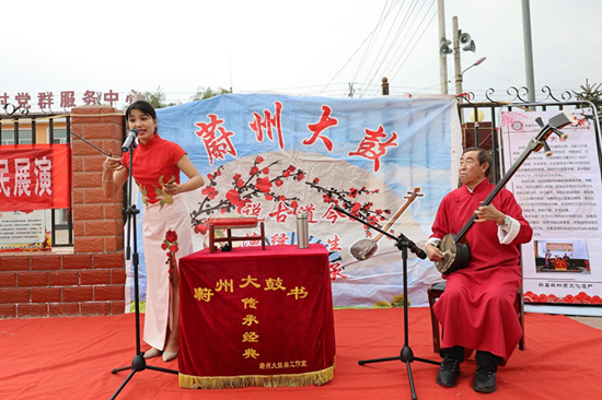 “蔚州大鼓第三代到第五代非遺傳承人都是陽眷人,本地受眾群體龐大,所以我們將黨的創新理論融入蔚州大鼓的演出內容,創作一系列曲目,在所轄各村進行巡回演出,宣傳黨的好政策。”陽眷鎮宣傳委員郭競競說。