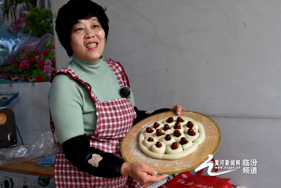 浮山县响水河镇杜村的姚晓慧,是浮山县制作枣花子、花古兰的手艺人代表者之一,姚晓慧蒸枣花馍、花古兰的手艺远近闻名,除腊月里代加工蒸栆山、枣花子外,日常还承接传统习俗中婚嫁寿诞、生日满月礼仪中所用的寿高、寿桃、多层插花古兰等,既传承了浮山传统文化,又可补贴家用。
