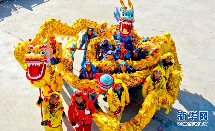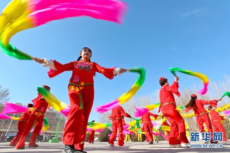 2022年1月28日,甘肃省张掖市临泽县板桥镇壕洼村社火表演队在文化广场上排练大秧歌。新华网发 (王将 摄)