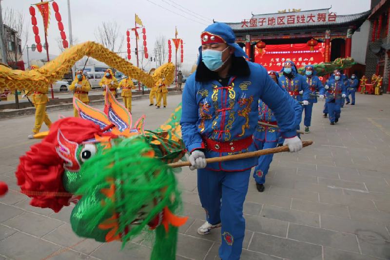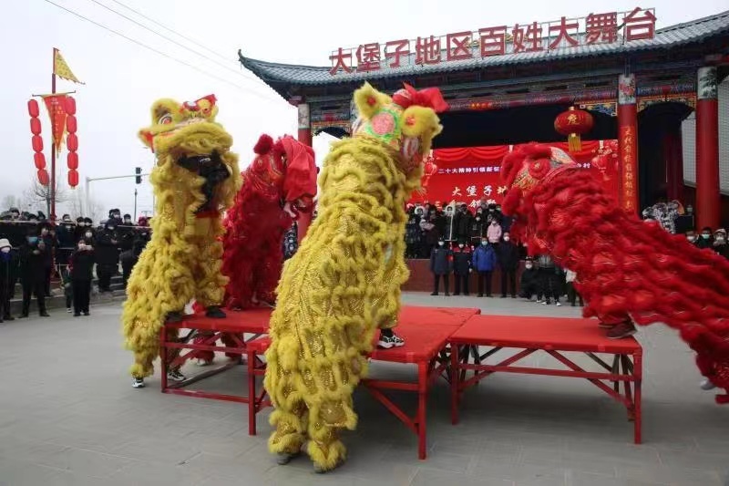 为了给本届年货节助威,陶北村的社火表演队员们身着华丽的服饰,打着欢快的鼓点相继亮相,脸上的喜悦难以掩饰。在一片欢快的锣鼓声中,只见2队舞龙人手持长龙,似蛟龙出海,一会在人群中穿梭,一会又腾飞云霄。与此同时,4只憨态可掬的狮子踢跳翻蹬,立卧滚抖,令在场的群众目不暇接,拍手叫好。“今年我们共组织了500余人社火表演队伍,集中排练12个节目,最近天气虽然寒冷,但是大家都乐在其中,每天都能按时按点来参加。这几天我们跳得更整齐了,希望能在春节社火展演时把更多的欢乐带给群众,让大家过一个欢乐祥和的春节。”陶北村社火表演队负责人朱海红说。