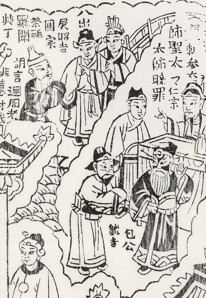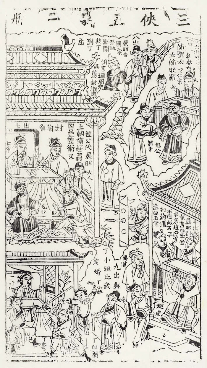 宋仁宗时,南侠展昭身手了得,数次有功于开封府,被皇帝封“御猫”。卢方、韩彰、徐庆、蒋平、白玉堂五位义士不服,寻衅开封府,是为“五鼠闹东京”。后众人相继归顺,成为包拯部下。根据武强年画博物馆收藏的一套《三侠五义》灯方线版,该套《三侠五义》灯画本有四册,共二十出故事。本幅是第二册,与武强年画博物馆所藏第二册相比,大同小异,不同之处是此图在每一出画面旁边均增加了解释故事的题字。所绘故事内容依次为:庞太师赔罪(六出)、受封“御猫”(七出)、回乡祭祖(八出)、比武订婚(九出)、白玉堂石子打赵虎(十出)。刻绘人物繁多,情节生动,风格诙谐,市井气息浓郁。