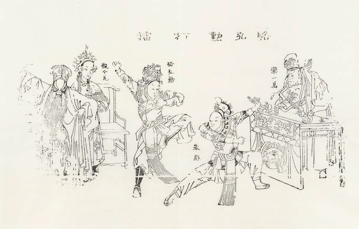 《骆宏勋打擂》图绘骆宏勋对战朱彪,鲍赐安急欲上前,鲍金花劝阻其父,神色镇定,栾一万则躲在一旁观瞧,情状猥琐。京剧《扬州擂》,一名《骆宏勋打擂》。故事见《绿牡丹》第三十六至三十七回。