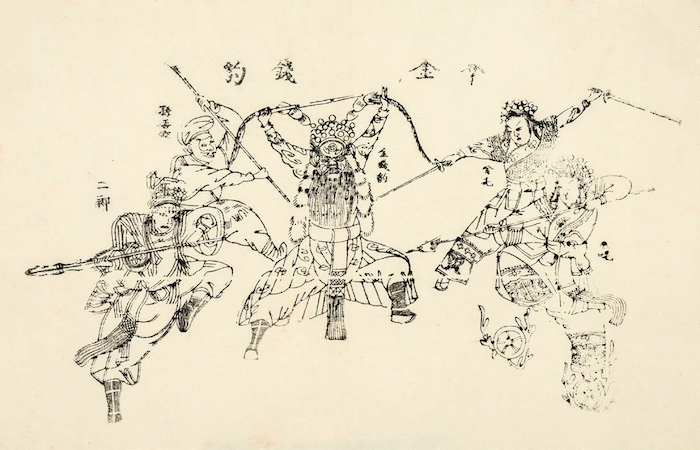 戏曲是以“出”为单位演出的,故专门表现舞台上的戏曲故事、人物、演出场面等内容的年画,又被称为“戏出年画”。在农村的炕边土墙上张贴此类年画,不仅可令新春的冬日平添灿烂,又可满足家人常年看戏之愿望。传统的道德观念,忠孝节义的思想,也通过这些贴在墙壁上的图画得以世代相传。