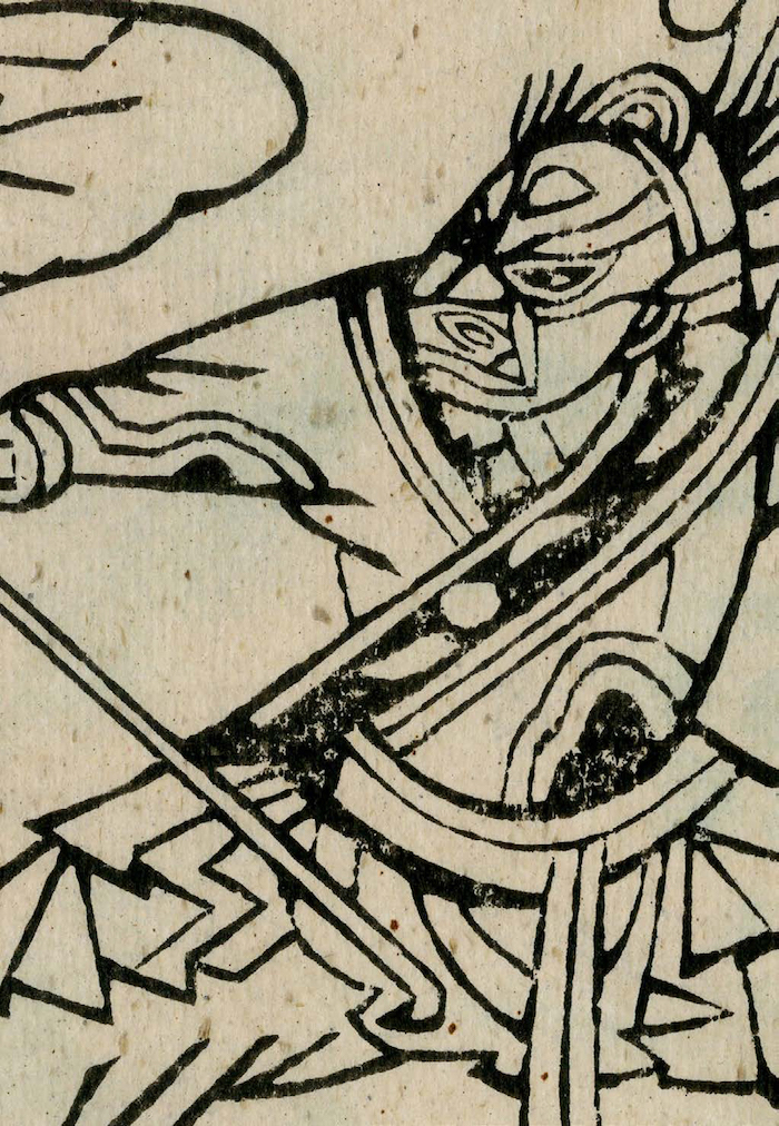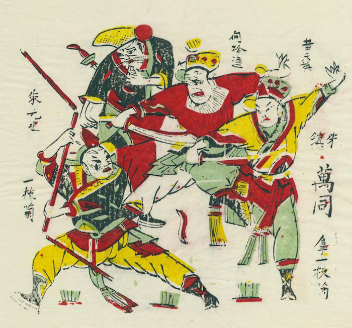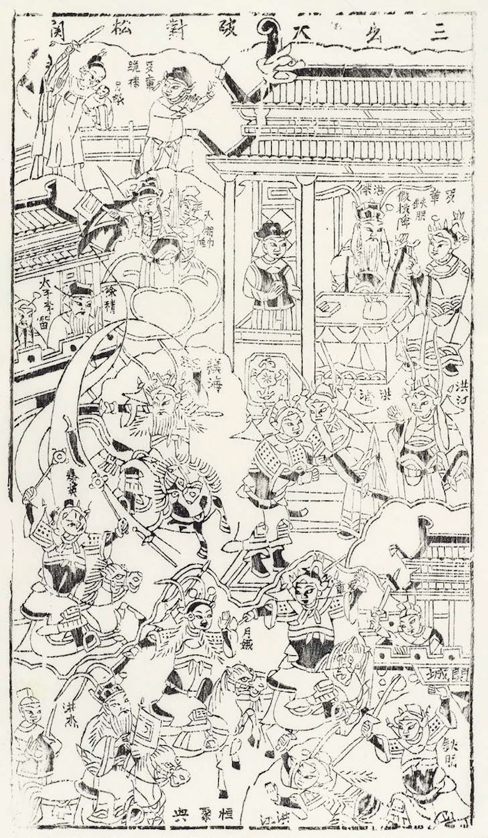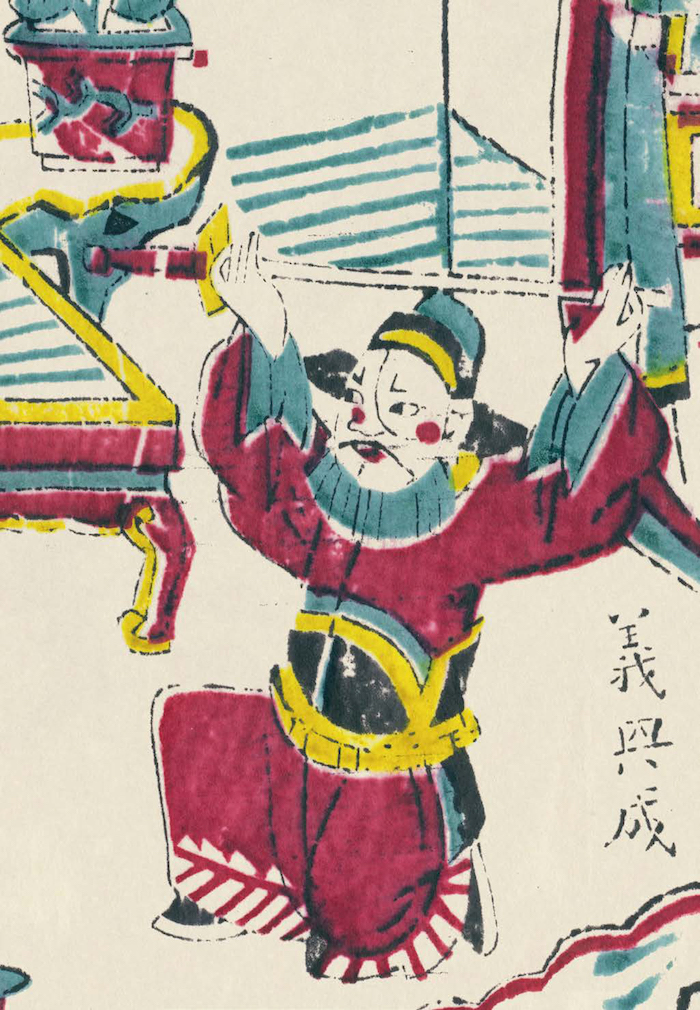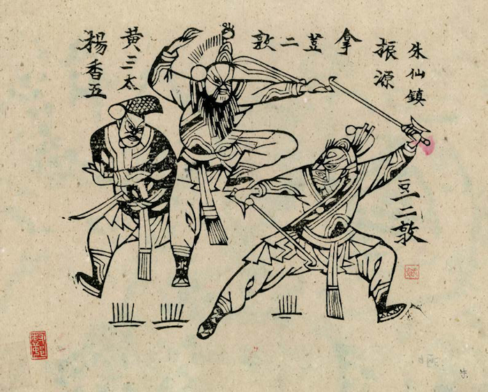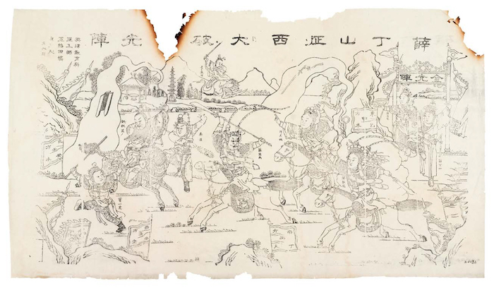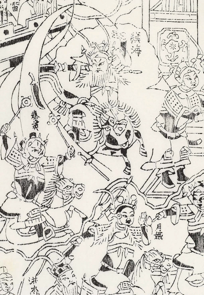 此图来自“振源”画店,虽仅存墨线版,但线刻遒劲,造型古朴大气,已足见其水准。重庆中国三峡博物馆藏有一件朱仙镇“中兴”画店的完成品年画,可与此图对读,尤其是黄三太手持暗器的细节更为形象具体。