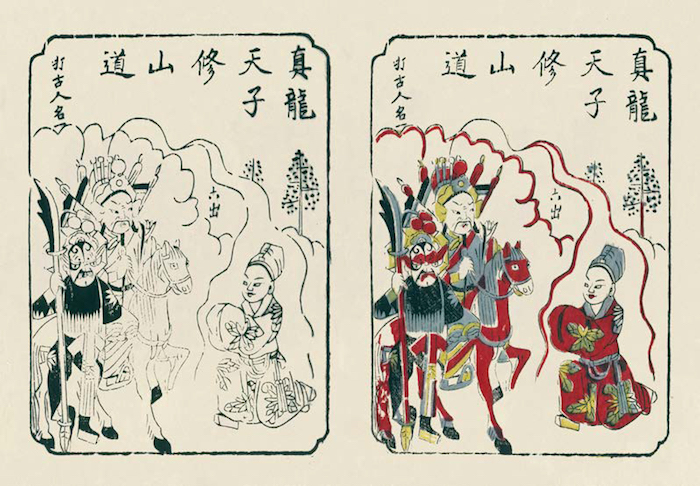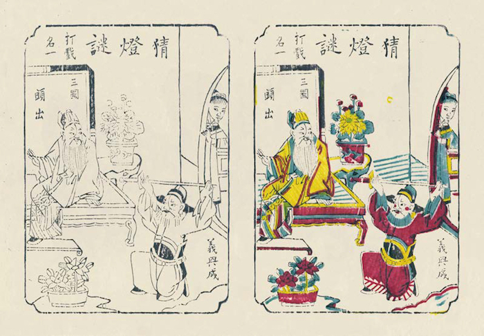 北方农历新年有赏灯的习俗,灯画上的谜语,可供人解玩。此二图一为墨线,一为套色,对比观看,别有一番趣味。画面上方题有“真龙天子修山道”的谜面,谜底未详,有人猜“王安石”,别解为“王安装石头”。还有人猜“王通”,别解为“君王使山路开通”。