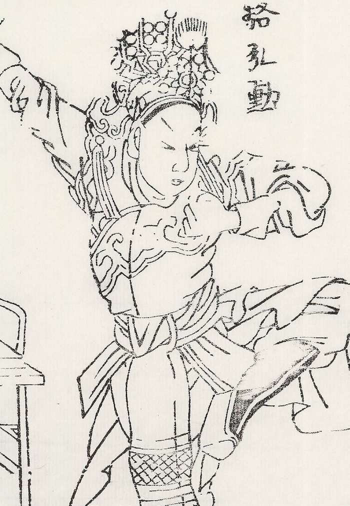 康熙时,镖客黄三太为彭朋复职行贿,令人持金镖向绿林借钱,至河间府窦尔敦(图中写作“豆二敦”)处,窦不予,且痛斥之。黄三太闻报,约在李家店与窦比武较量。对阵不敌,黄暗施“甩头一子”打伤窦尔敦,窦羞愤而去。