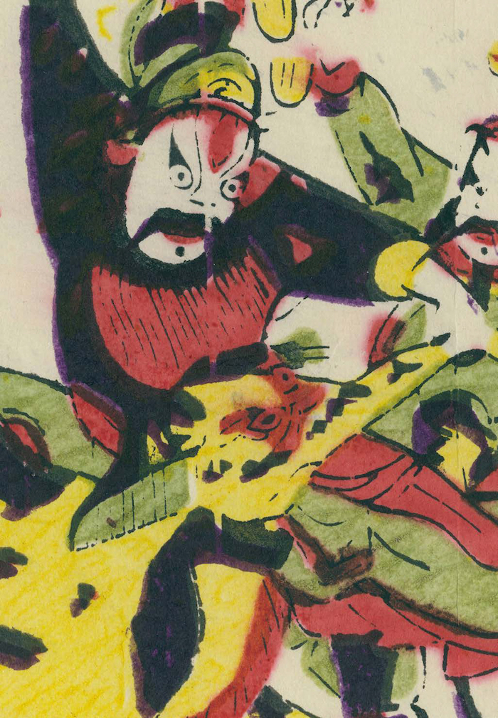 在杨柳青年画制作中,“线坯”又称“线坯子”,是由墨线版刷印出来的墨线稿。乃是年画未经套色与手绘之前的版印墨线状态。与色版相比,“线版”显然更加重要,往往决定着年画在造型上的艺术水准,由此也被称为“主板”。《拿金钱豹》墨线版,孙悟空与二郎神部分有重影现象,是刷版时纸张或雕版松动所致,当属于废品。作为收藏者,我们换个角度来看,这个失误却也意外增加了形象的动感。