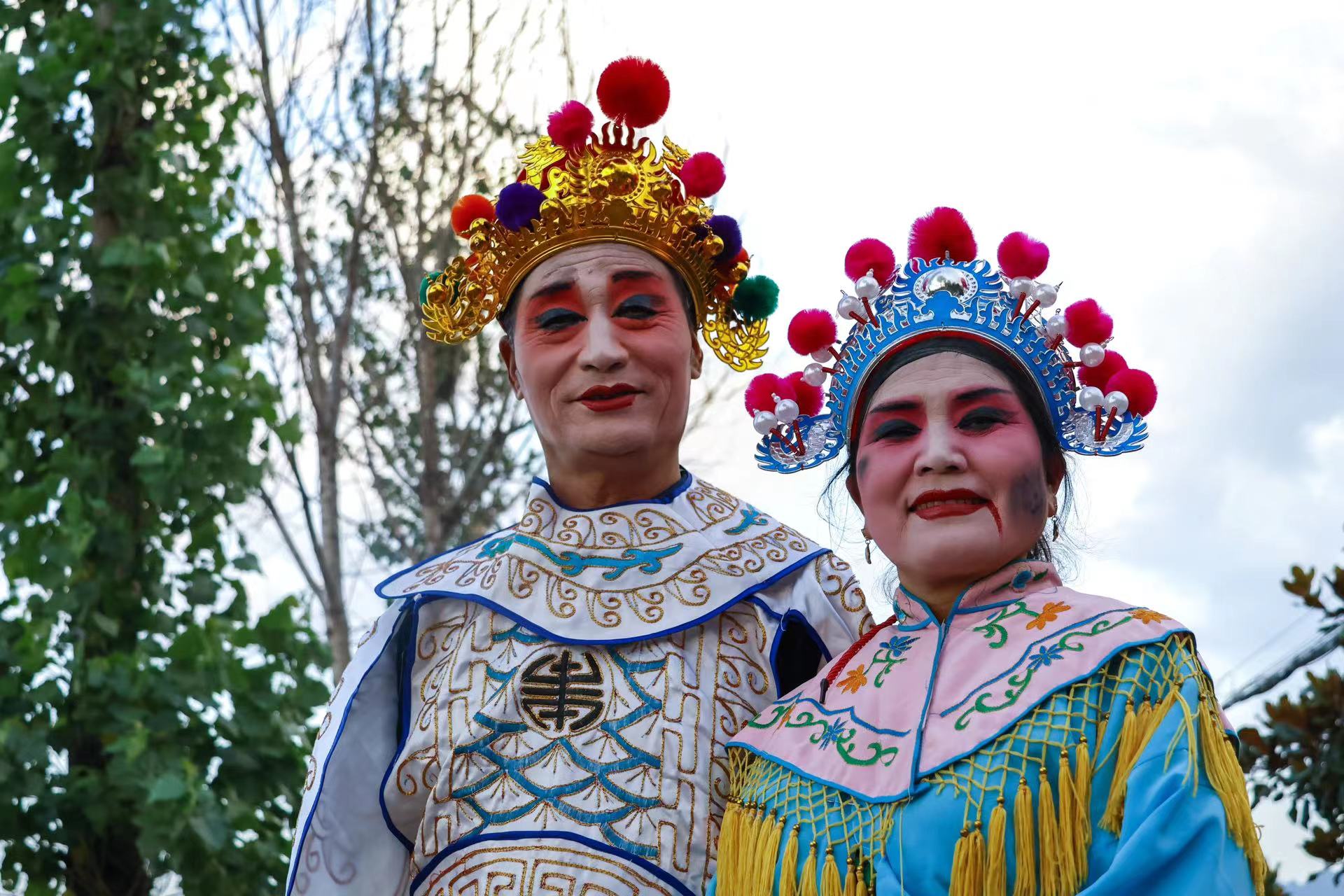 第一天,我邀请了几位阿姨揉花馍、组装花馍;第二天早上,开始做社火的化妆。我提前租好了衣服,邀请了两个专门给剧团化妆的老师,她们给阿姨们化了“家暴妆”,即脸上带一点淤青、血痕的那种妆容。当天下午五点半,我们开始围着几个村子巡演,一直到天黑。