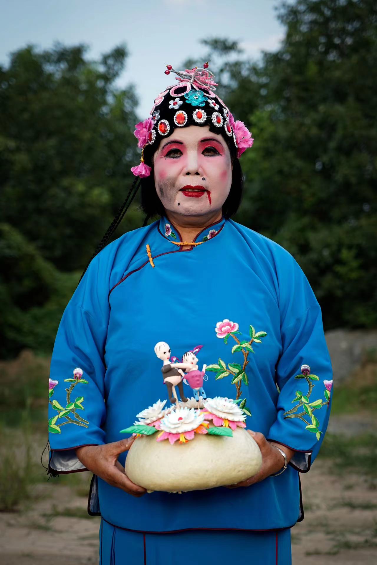 我挑选了7条家暴相关的新闻,都是丈夫以各种形式家暴妻子,并利用花馍的形式还原它,即在花馍上捏七个家暴的场景。此外,我又找了村里的七位叔叔和七位阿姨扮演“七对夫妇”,给他们化了“社火”的妆容,社火是陕西、甘肃一种游神的形式。